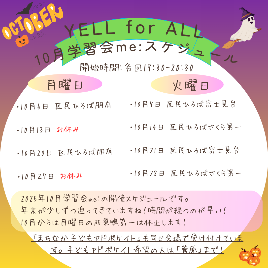 10月学習会me: 実施スケジュール Uncategorized 2025.09.29秋らしくなってきて、夕方は涼しく過ごしやすくなりましたね!10月からは隔週開催になります。スケジュールをチェックして、気軽に参加してください。引き続き、一緒に取り組んでいきましょう! YELL for ALL 小暮 勝哉関連