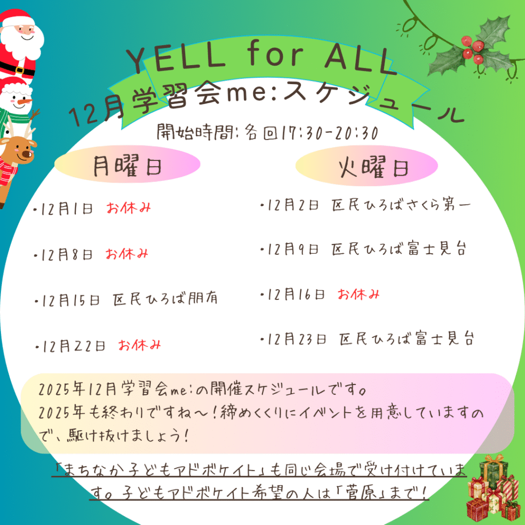 12月学習会me: 実施スケジュール Uncategorized 2025.11.30いよいよ12月です。寒さで動きづらい季節ですが、あたたまりながら、ゆっくり学習を続けていきましょう! YELL for ALL 小暮勝哉関連