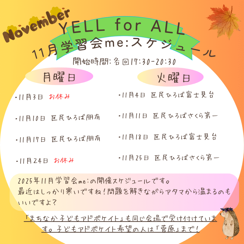 11月学習会me: 実施スケジュール Uncategorized 2025.10.29日に日に秋が深まり、少しずつ冬の気配も感じますね。11月も元気に楽しく取り組みましょう! YELL for ALL 小暮 勝哉関連