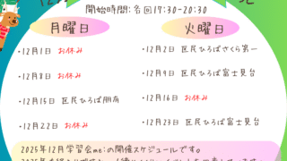 Uncategorized12月学習会me: 実施スケジュール いよいよ12月です。寒さで動きづらい季節ですが、あたたまりながら、ゆっくり学習を続けていきましょう! YELL for ALL 小暮勝哉 2025.11.30Uncategorized